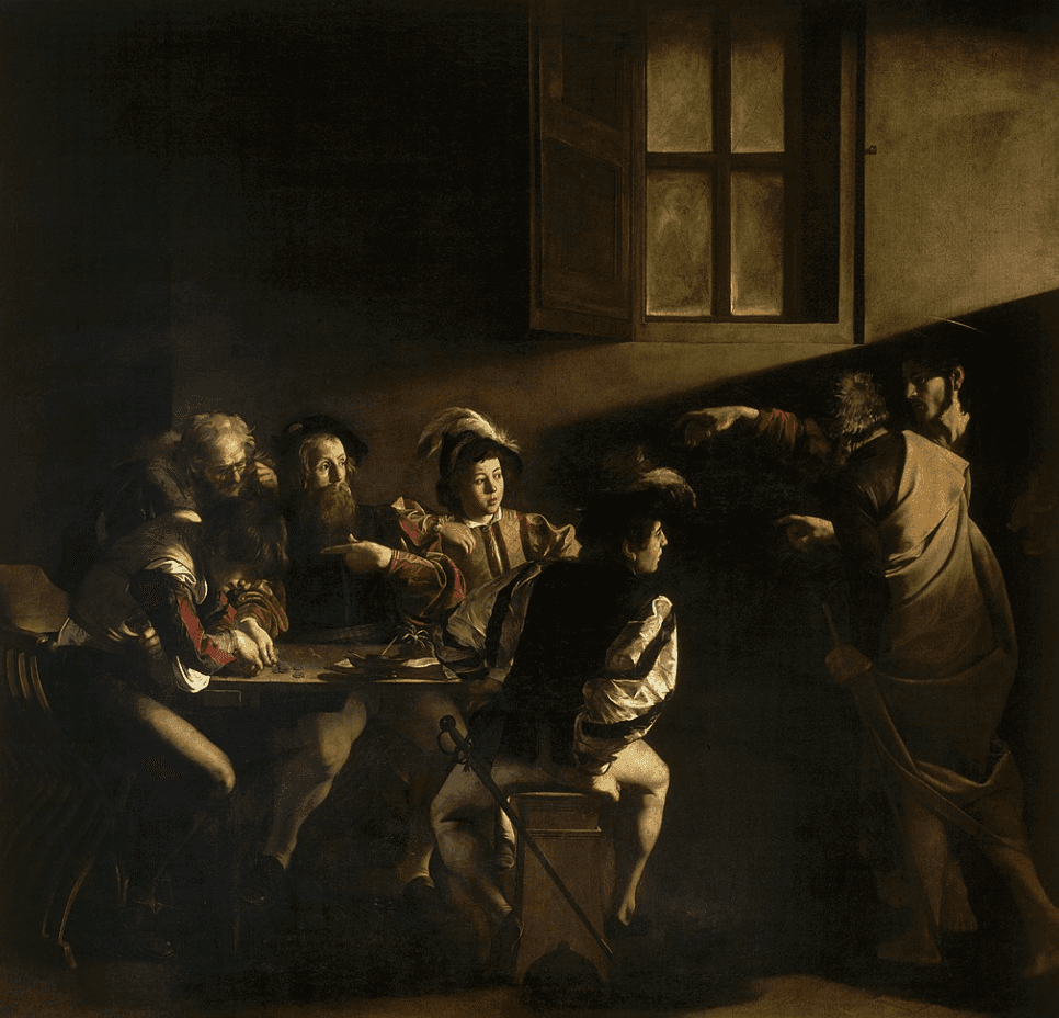 Caravaggio's “The Calling of Saint Matthew” (1599–1600), a Baroque masterpiece exemplifying his dramatic chiaroscuro and naturalistic detail. The painter’s revolutionary play of light and shadow imbues a simple tavern scene with profound spiritual intensity.