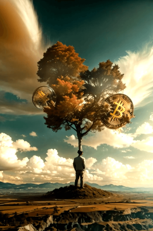 "Blissful Bitcoin" by Malina Jordan: This artwork symbolizes the strength and growth of Bitcoin as a leading cryptocurrency. It depicts a robust money tree, representing individuals becoming self-sustaining through digital currency.