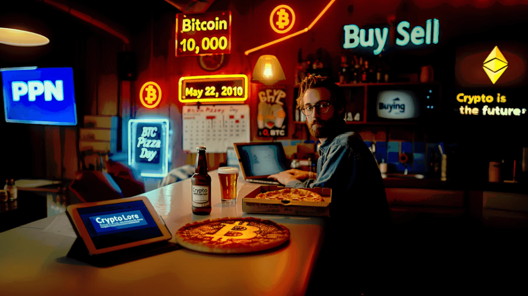"The Birth of Bitcoin Pizza Day" by JoeZImages: This piece marks the first-ever commercial Bitcoin transaction on May 22, 2010, when 10,000 BTC were exchanged for two pizzas. The artwork portrays an intimate apartment setting filled with crypto paraphernalia, capturing the blend of ordinary life and groundbreaking digital finance.